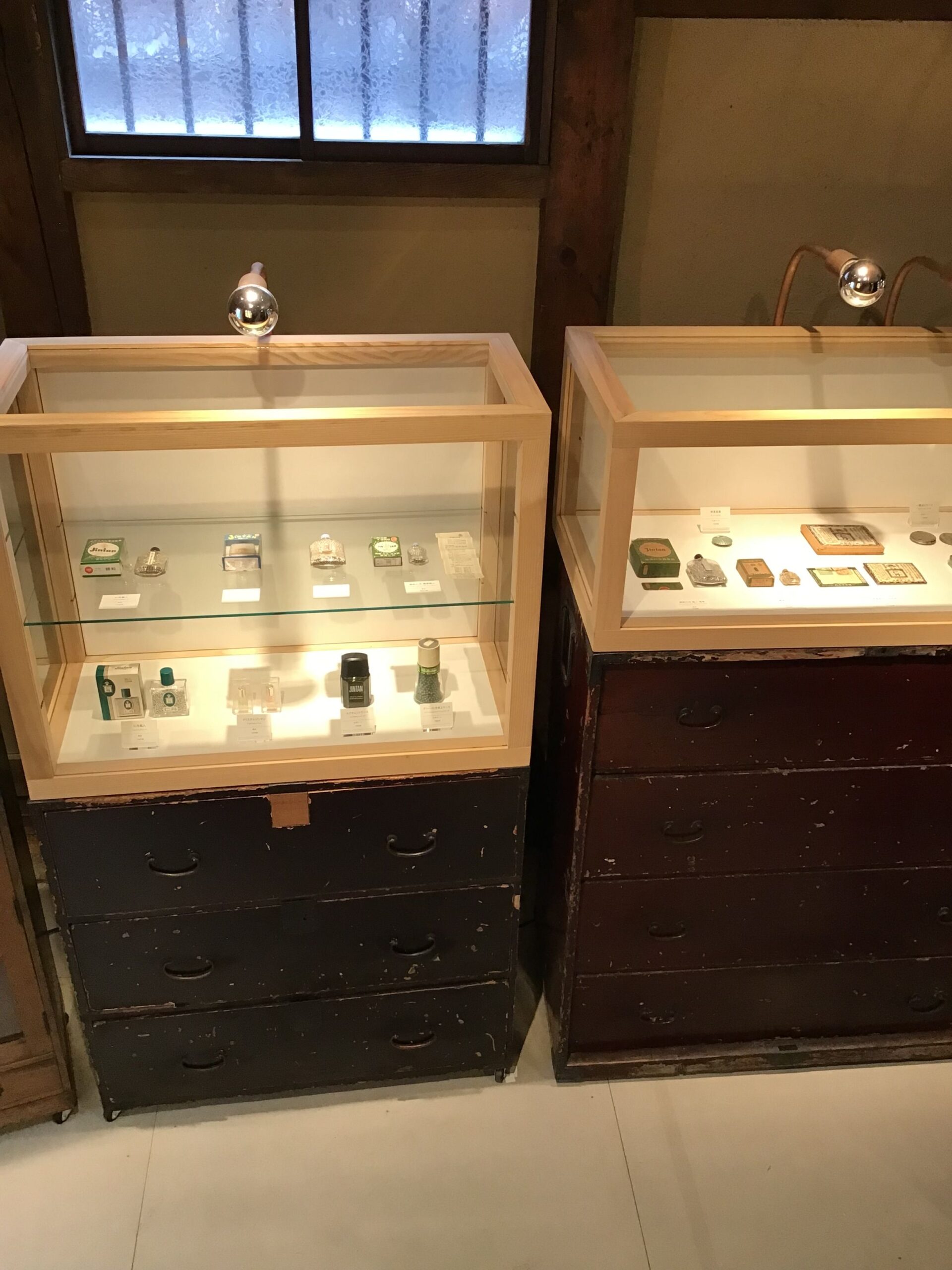 蔵のギャラリーに銀粒仁丹のパッケージの歴史を展示いたしております。貴重なガラスびんの容器やポスターも飾っておりますのでこの機会にぜひお立ち寄りくださいませ。